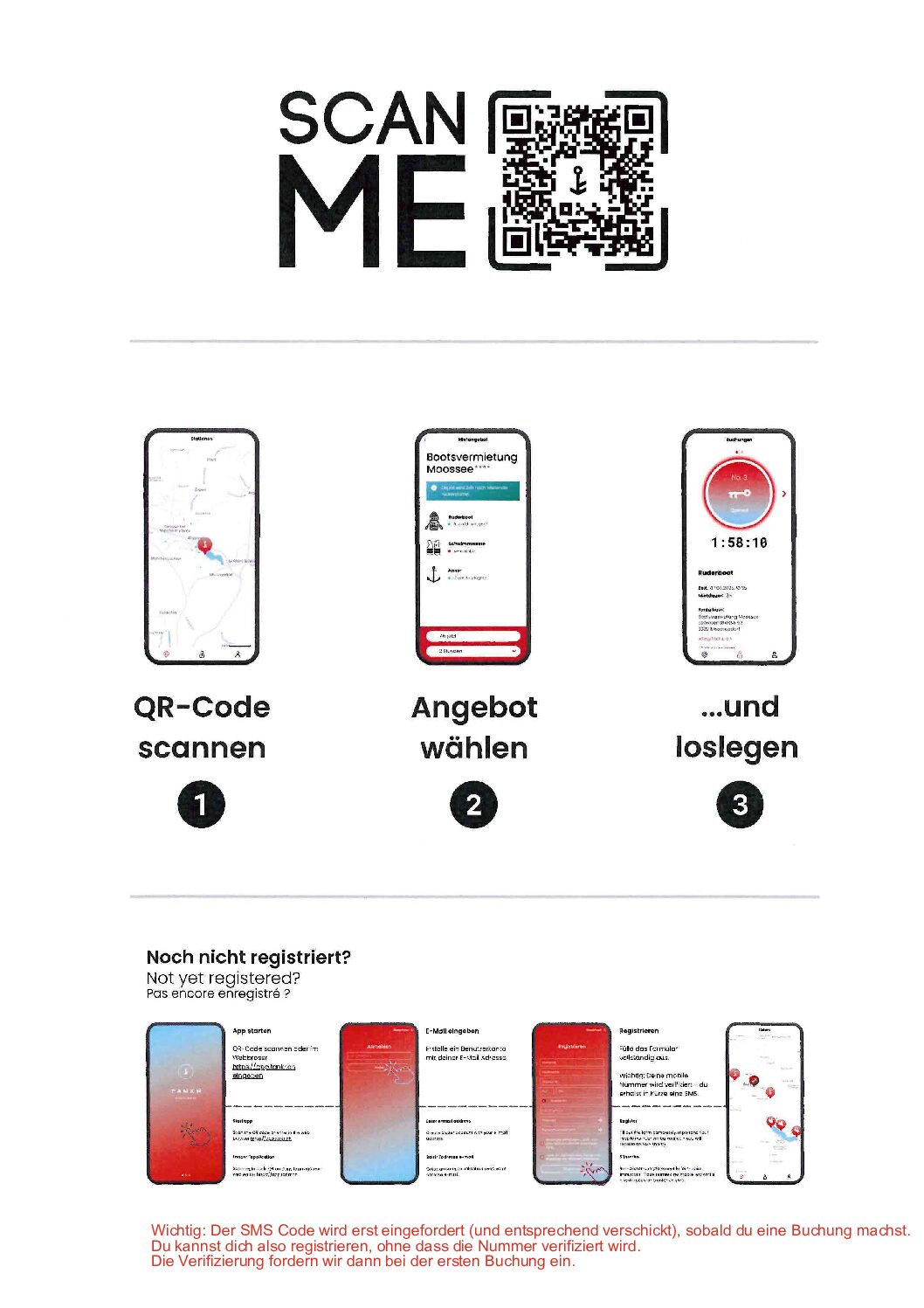 Die Stiftung Nutzung Moossee geht mit der Zeit. Die Bootsvermietung erfolgt ab der Saison 2025 komplett personalfrei. QR-Code scannen und loslegen: Nach einer einmaligen Registration wird mittels Smartphone gebucht und bezahlt. Boote können bequem von zu Hause aus reserviert werden – die digitale Lösung der Firma Tankr ist rund um die Uhr erreichbar. Die Kundschaft profitiert von konstanten, wetterunabhängigen Öffnungszeiten. Bei einer Bootsnutzung wird es von zentraler Bedeutung sein, die Bootsruder nach deren Nutzung ordnungsgemäss im entsprechenden Vermietungsfach einzulegen und die Buchung/Mietung via App abzuschliessen.